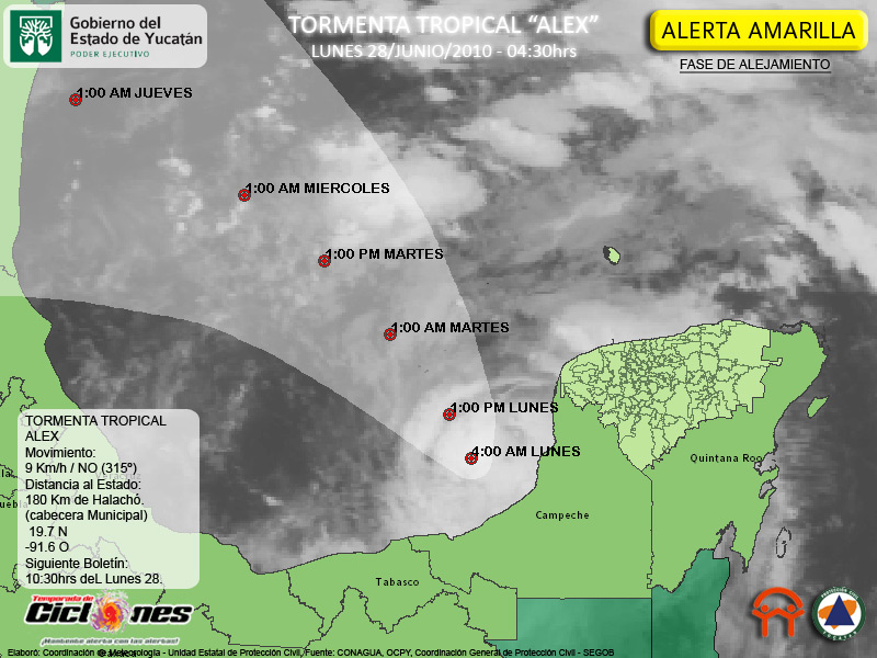La Tormenta Tropical Alex continúa esta mañana su desplazamiento hacia el Noroeste sobre el Golfo de México, permanece en efecto Alerta Amarilla de Alejamiento para los Municipios con frontera con el Estado de Campeche, especialmente por la posibilidad de lluvias intensas.