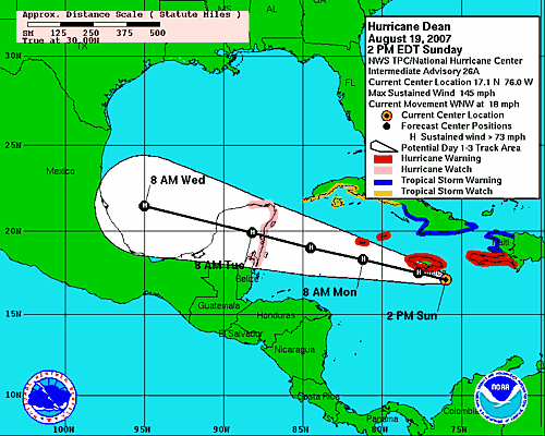 El Extremadamente Peligroso Huracán "Dean" avanza rapidamente hacia el Oeste con rumbo hacia la Peninsula de Yucatán, estableciendo una Alerta Naranja para la misma, se mantiene en estrecha vigilancia por su trayectoria probable. Se recomienda a la población mantenerse informada de la trayectoria futura. Estados de afectación: Yucatán, Quintana Roo y Campeche.