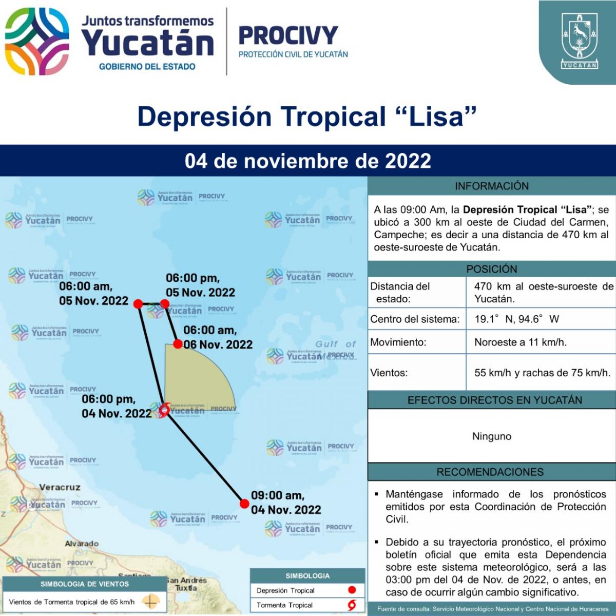 La Depresión Tropical "Lisa"; se ubicó a 300 km al oeste de Ciudad del Carmen, Campeche;.
