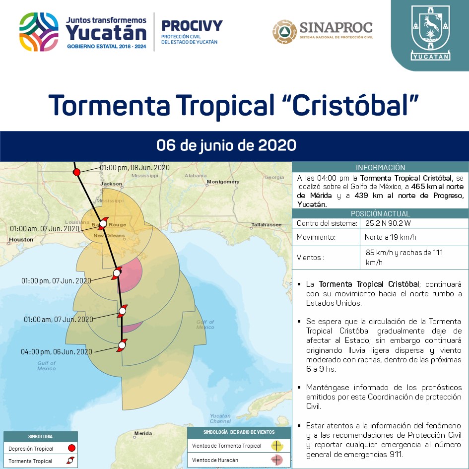 A las 04:00 pm la Tormenta Tropical Cristóbal, se localizó sobre el Golfo de México, a 465 km al norte de Mérida y a 439 km al norte de Progreso, Yucatán, se mueve hacia el Norte a razón de 19 km/h con vientos de 85 km/h y rachas de 111 km/h.