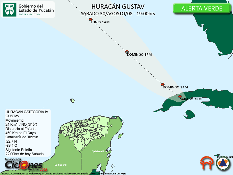 Se espera que Gustav continúe con su desplazamiento hacia el Noroeste durante las próximas horas y de esta manera emerger durante esta noche al Golfo de México.