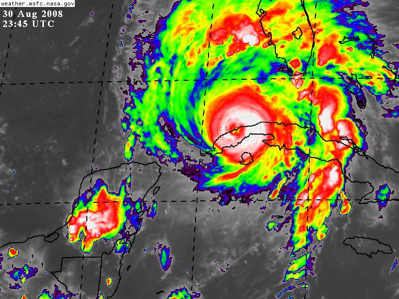 Gustav sobre tierra como Huracán Categoría IV en el Oeste de Cuba. Se caracteria por un rapido desplazamiento.