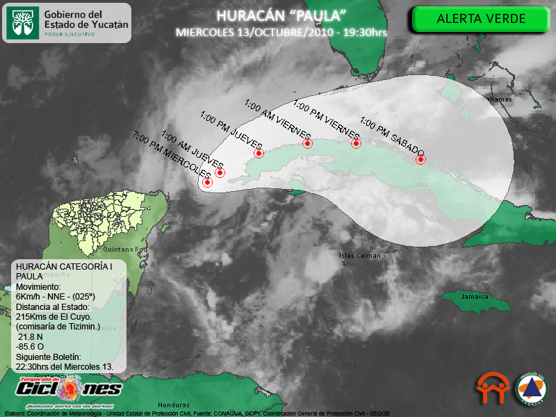 Se espera que el Huracán Paula continúe con un desplazamiento hacia el Noreste aproximandose a las Costa Norte de Cuba hoy por la noche y mañana por la mañana.