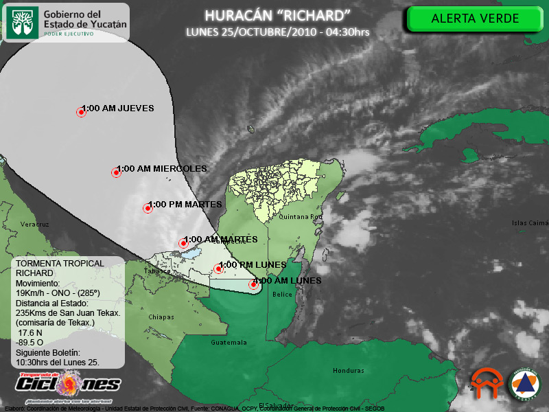 Debido a su desplazamiento sobre Tierra, y como se ha comentado con anterioridad, se espera que la Tormenta Tropical Richard continúe con un debilitamiento gradual durante el día de hoy Lunes, para emerger posiblemente como una Depresión Tropical al Golfo de México en las inmediaciones de Ciudad del Carmen, Campeche las primeras horas del día Martes.