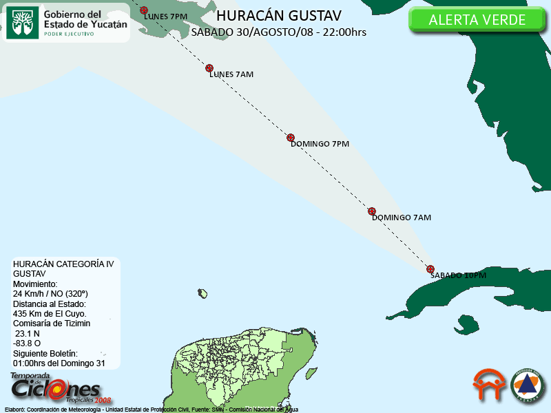 Se espera que Gustav continúe con su movimiento hacia el Noroeste durante las próximas horas, y asi continuar con su trayectoria sobre el Centro del Golfo de México durante el Domingo.