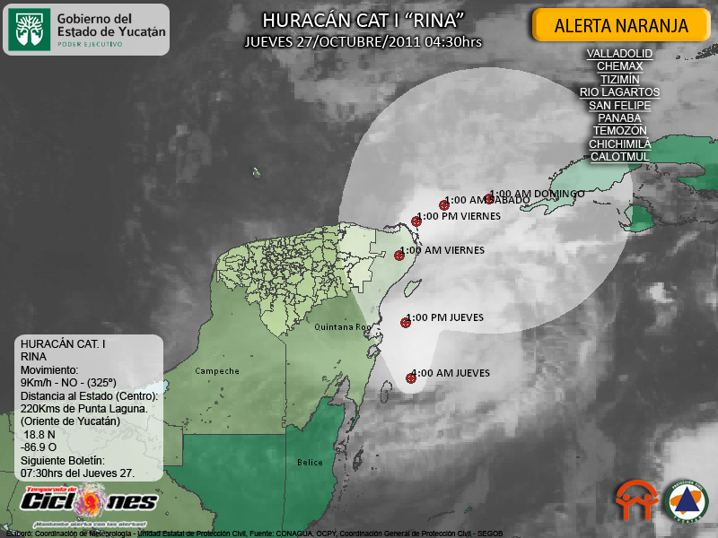 Debido a la proximidad del Huracán Rina, de manera protocolaria y en alcance al Sistema de Alerta Temprana para Ciclones Tropicales SIAT-CT se decreta en efecto Alerta Naranja para los Municipios de Valladolid, Chemax, Tizimín, Rio Lagartos, San Felipe, Panabá, Temozón, Chichimilá y Calotmul.