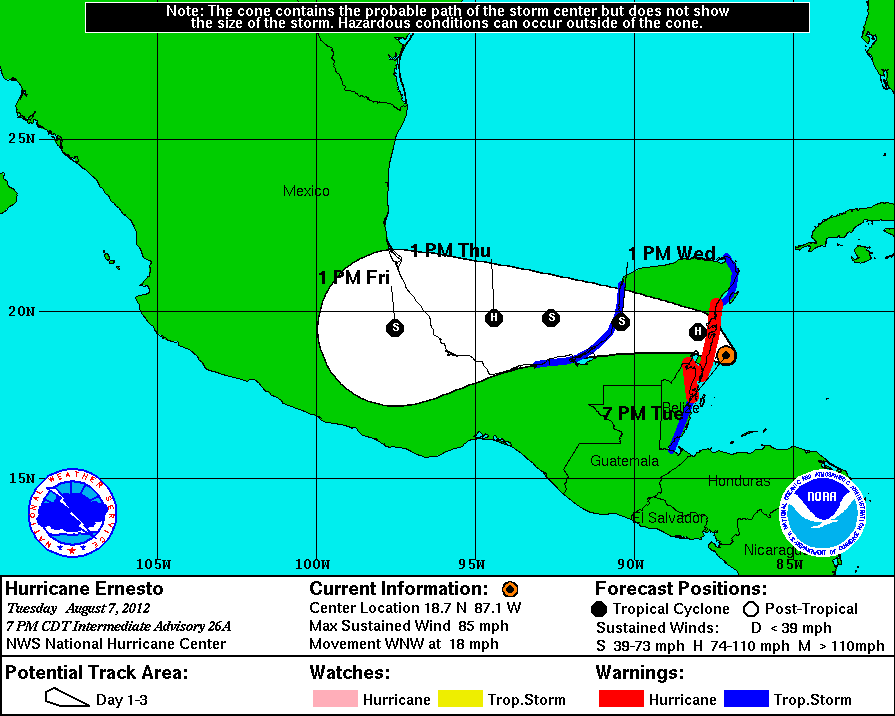 El Centro del Huracán Categoría uno en la Escala Saffir Simpson de Ciclones Tropicales es estimado esta noche a 105Kms de Chetumal, Quintana Roo, en las inmediaciones de Banco Chinchorro, a 245Kms de la Cabecera Municipal de Peto, Yucatán.