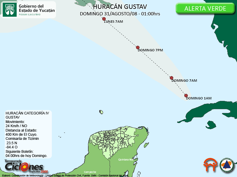 Gustav continúa su desplazamiento sobre el Sureste del Golfo de México. Se desplaza rapidamente, de acuerdo a lo pronosticado con anterioridad.