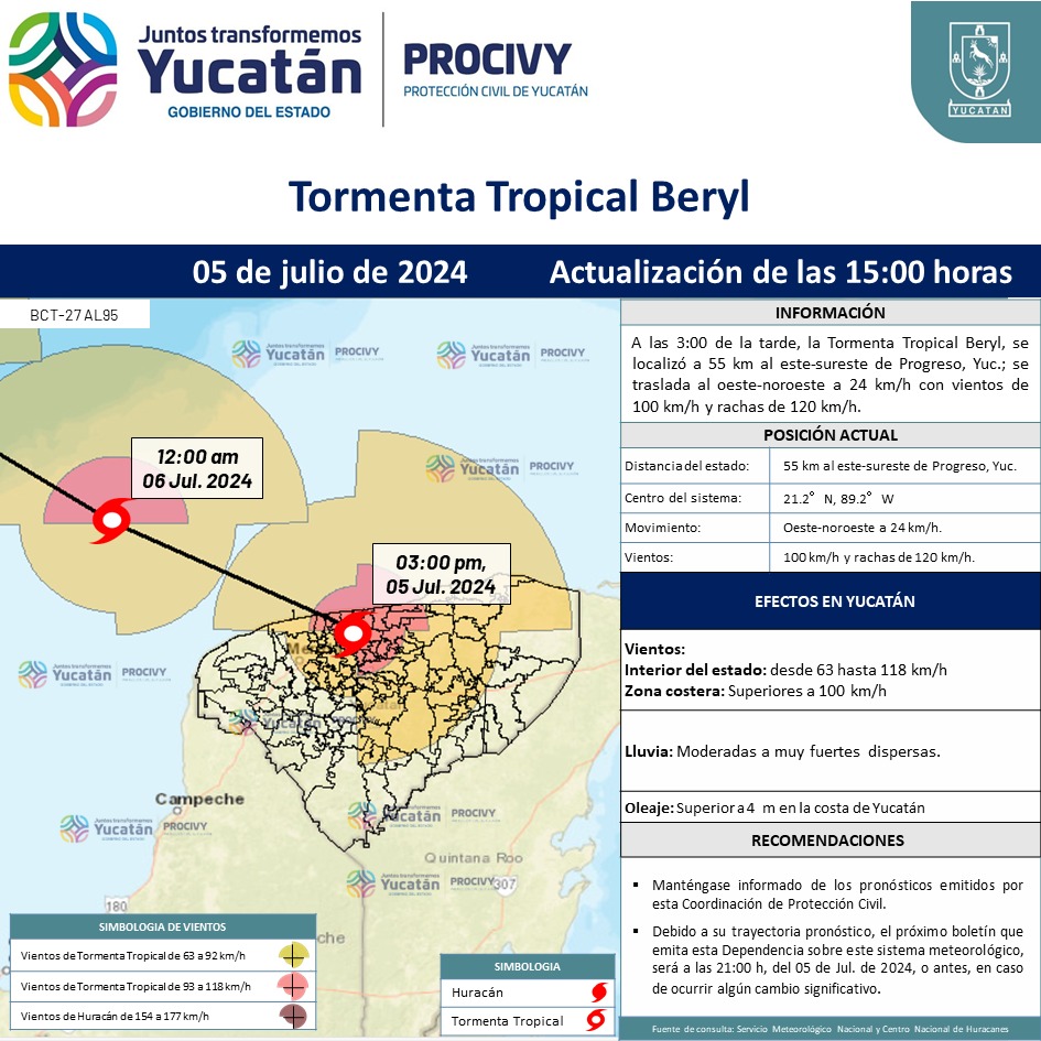 A las 3:00 de la tarde, la Tormenta Tropical Beryl, se localizó a 55 km al este-sureste de Progreso, Yucatán.