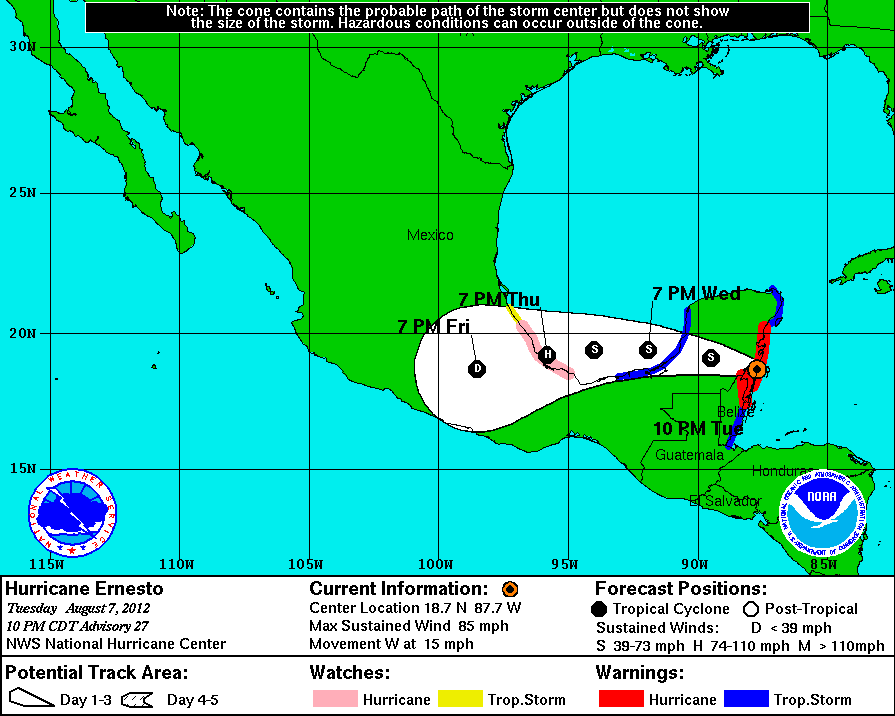 El Centro del Huracán Ernesto se estima a 200Kms de la Cabecera Municipal de Peto, 65Kms de Chetumal, Quintana Roo. Vientos de Tormenta Tropical pueden extenderse hasta 130Kms hacia el Nororeste del Sistema, por lo que condiciones adversas son posibles a 70Kms de la Cabecera Municipal de Peto.