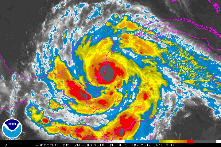 El Huracán Ernesto se encuentra próximo a tocar tierra en la Costa Sur de Quintana Roo en las inmediaciones de Mahahual, El huracán de Categoría uno con vientos sostenidos de 140Km/h y rachas de hasta 170Km/h presenta un desplazamiento hacia el Oeste a razón de 24Km/h.