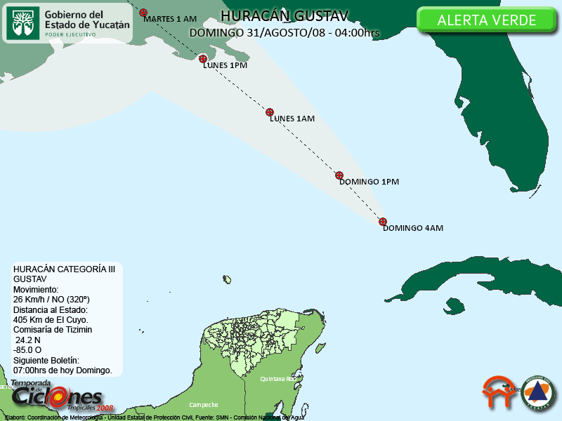 Gustav continúa su desplazamiento sobre el Sureste del Golfo de México. Se desplaza rapidamente, de acuerdo a lo pronosticado con anterioridad.