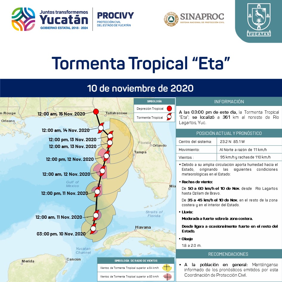 La Tormenta Tropical Eta; se localiza a 361 km al noreste de Río Lagartos, Yucatán.