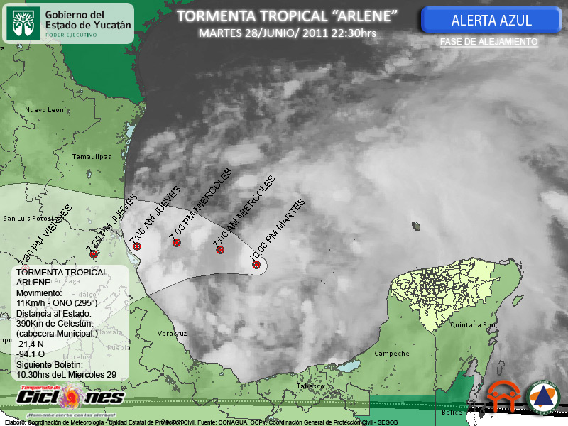 La Tormenta Tropical Arlene se mantiene con un lento desplazamiento hacia el Oeste - Noroeste, a una velocidad de 11Km/h, su centro se estima aproximadamente a 390Km de Celestún, Yucatán, y a 400Km de Tampico, Tamaulipas, 345Km de Tuxpan, Veracruz,