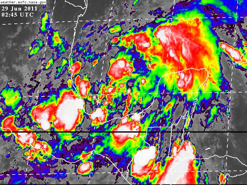 Se observa importante nubosidad asociada, la cual cubre toda la Península de Yucatán, así como el Itsmo y Golfo de Tehuantepec, situación que favorece condisciones de cielos nublados a cerrados, así como lluvias moderadas a fuertes en nuestra entidad, mismos aspectos que han sido reportados por las Unidades Municipales de Protección Civil del Interior del Estado.