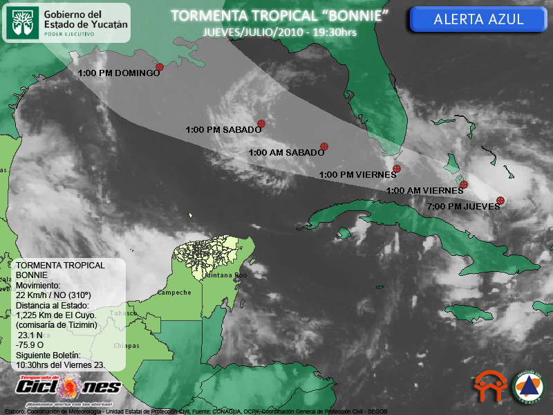 La Tormenta Tropical Bonnie no representa riesgos en este momento para el Estado de Yucatán. Permanece en efecto Alerta Azul (Peligro Minimo) para nuestro estado.