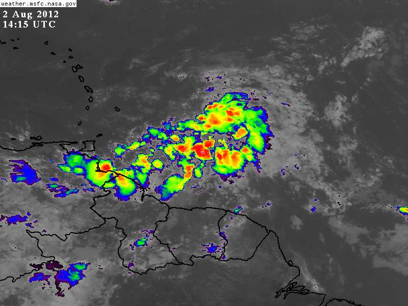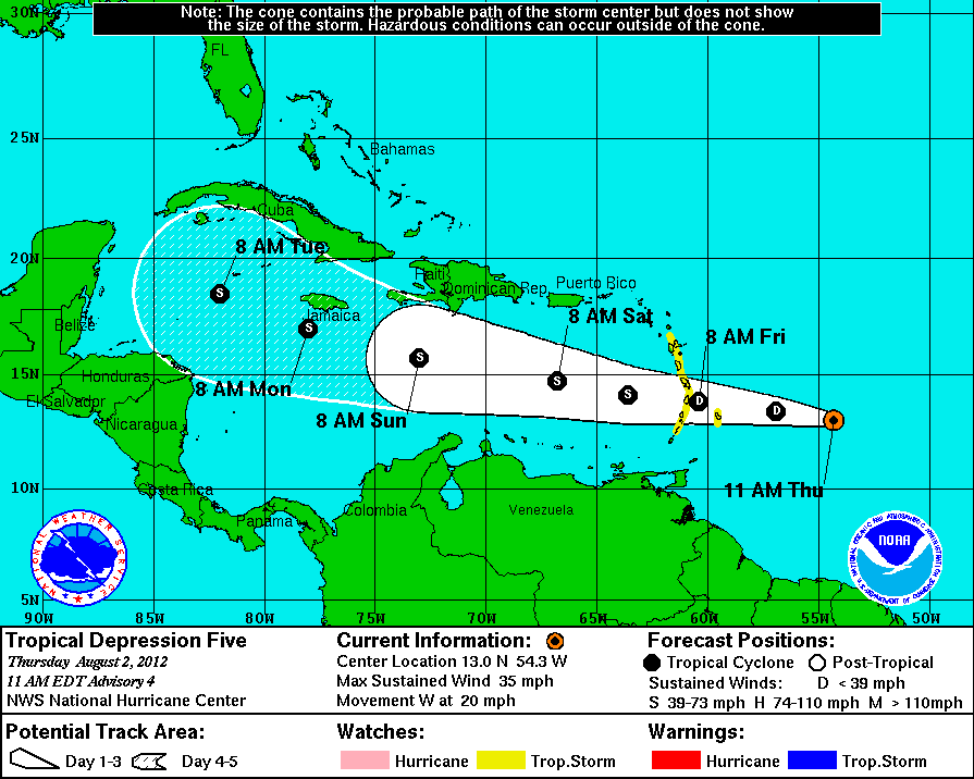 El Centro de la Depresión Tropical # 5 se estima esta mañana 725Kms de las Islas de Barlovento en las Antillas Menores, 3,650Kms de Popolnah, Comisaría de Tizimín, Yucatán.