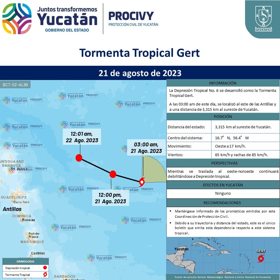 La Depresión Tropical No. 6 se desarrolló a Tormenta Tropical #Gert, se localiza al Este de las Antillas a una distancia de 3,315 km al sureste de Yucatán, se mueve al Oeste a una velocidad de 17 km/h con vientos de 65 km/h y rachas de 85 km/h.