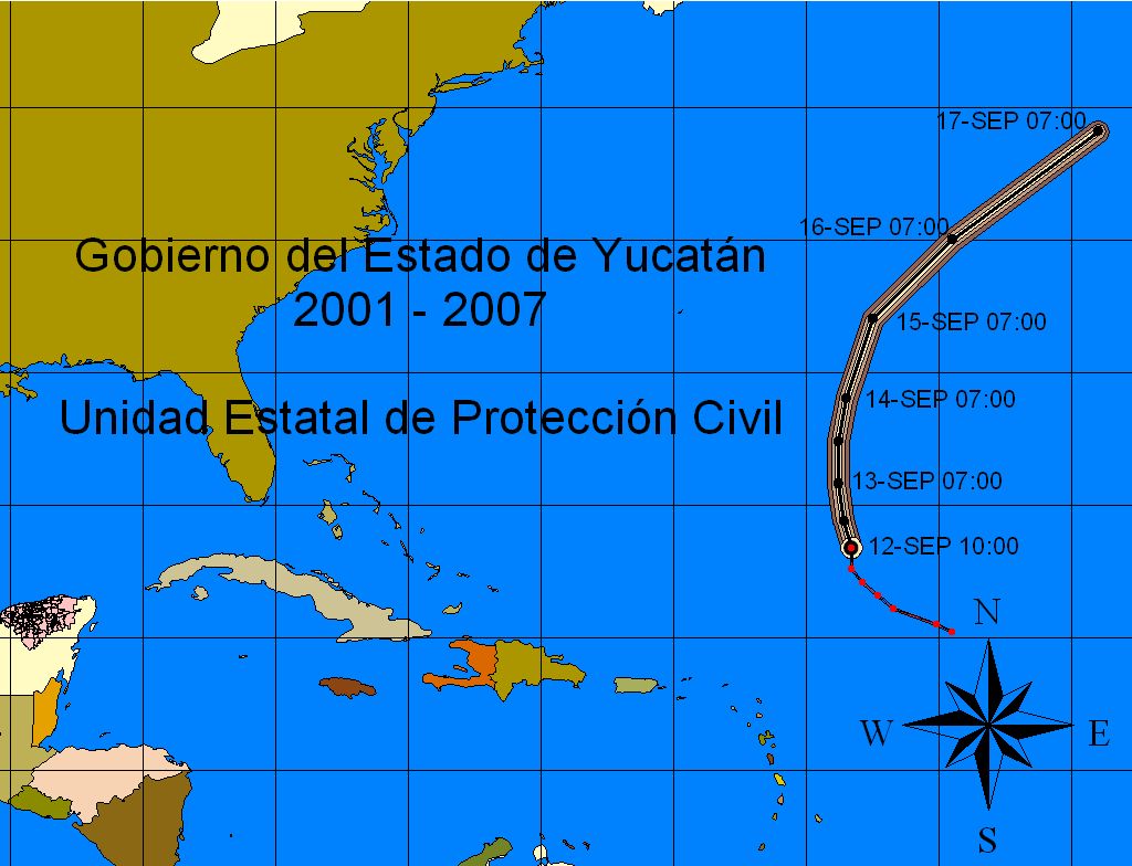 Distancia del centro de la tormenta tropical al Estado de Yucatán: 3,015 Kms. de San Arturo, Tizimín