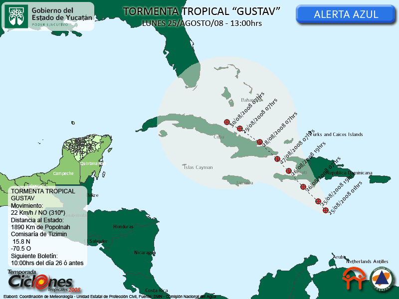 Se espera que la Tormenta Tropical Gustav, continúe con su desplazamiento hacia el Noroeste aproximandose a la Categoría de Huracán mientras se acerca a las Costas de Haiti.