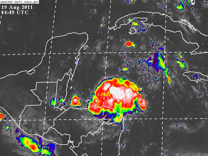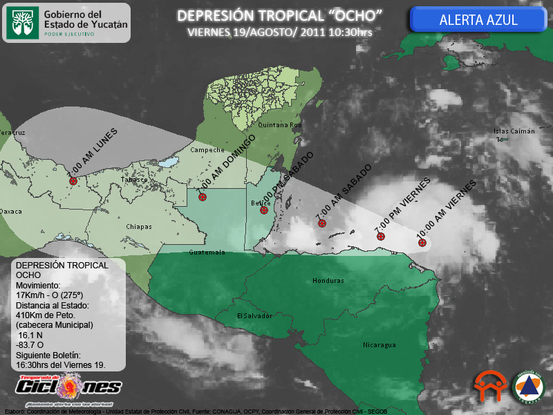 Esta mañana el Centro de la Depresión Tropical #8 es estimado a 555Km de Chetumal, Quintana Roo, 710Km de Peto, Yucatán, los vientos sostenidos del Sistema se mantienen en 55Km/h como desde su formación, las rachas son de hasta 75Km/h, sin emargo imágenes de satélite hacen evidente que la actividad significativa asociada a la Depresión Tropical se concentra en las inmediaciones de su Centro.