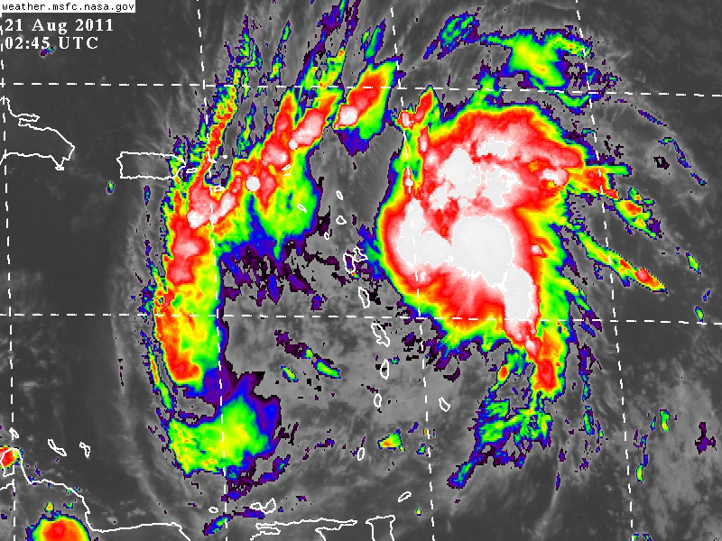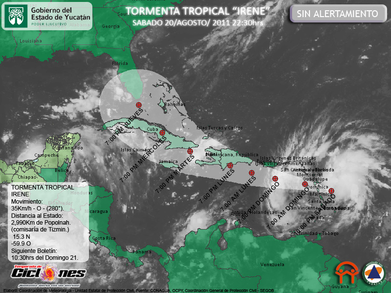Se espera que la Tormenta Tropical Irene se desplace sobre el Mar Caribe durante mañana Domingo, el escenario planteado hoy por la noche, implica una inmiente afectación a las antillas menores y Puerto Rico el día de mañana, para posteriormente, amenazar a Republica Dominicana y Haiti hacia el día Lunes, así como el Este de Cuba al anochecer del Martes.