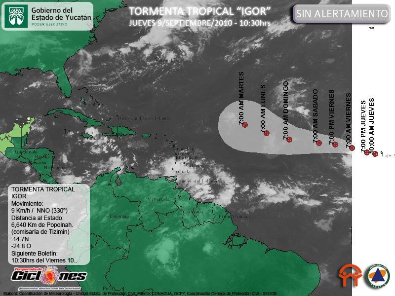 Será necesario observar el comportamiento de la Tormenta Tropical IGOR durante los próximos días, para descartar definitivamente alguna posible afectación a la Península de Yucatán, situación que no puede predecirse con certeza por el momento.