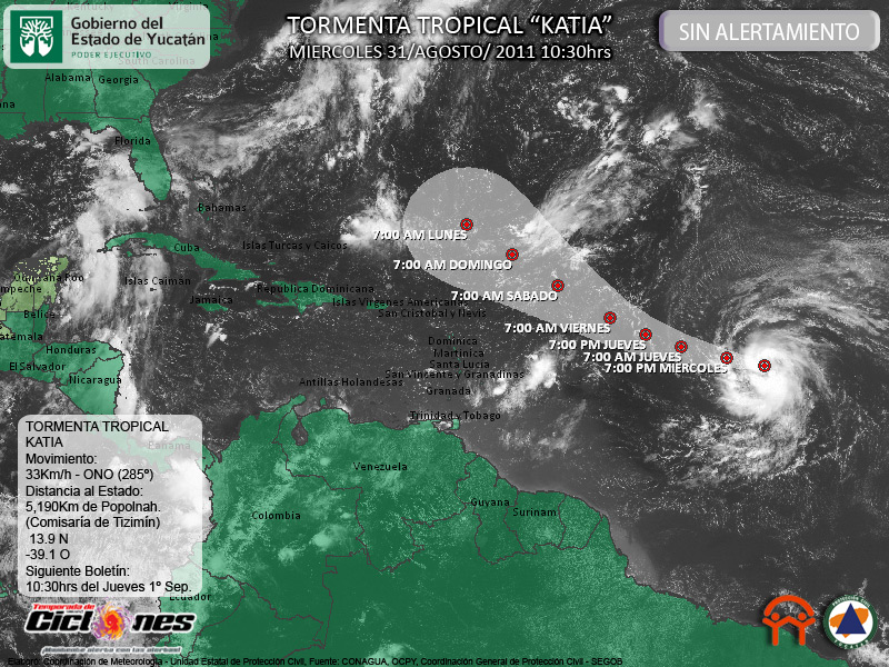 Katia no representa Riesgo para la Península de Yucatán, por consiguiente No hay Alertamiento para nuestra entidad en el marco del Sistema de Alerta Temprana para Ciclones Tropicales SIAT-CT.