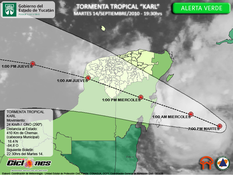 La Tormenta Tropical Karl se ha intensificado ligeramente, ahora con vientos sostenidos de 75Km/h los cuales se encuentran concentrados en una pequeña zona al Este de su Centro, su centro se estima a 370 de Chetumal, Quintana Roo y a 410Km de la cabecera Municipal de Chemax, Yucatán.