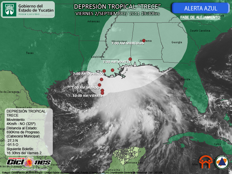 Esta mañana la Depresión Tropical #13 presenta un desplazamiento prácticamente estacionario sobre el Golfo de México a 690Kms del Malecón Internacional de Progreso, continúa en un alejamiento gradual de nuestra entidad, mientras se aproxima a la Costa Sur de los Estados Unidos.