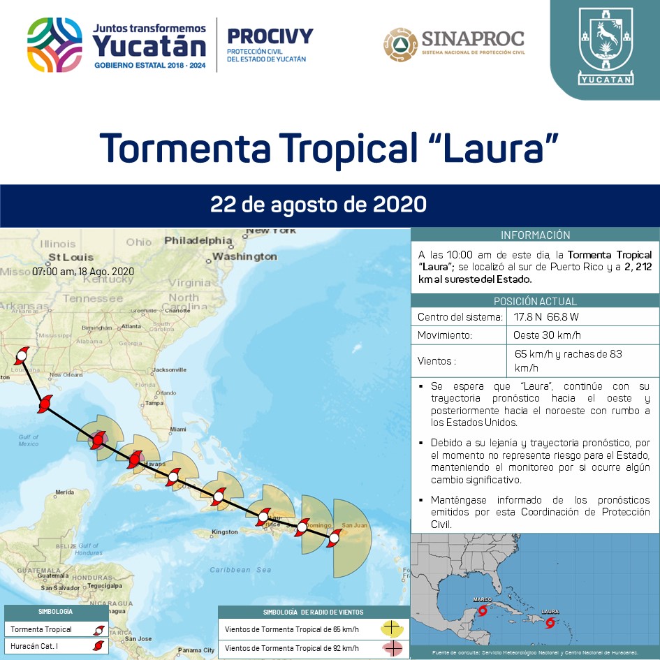 La Tormenta Tropical "Laura"; se localizó al sur de Puerto Rico y a 2,212 km al sureste de Yucatán.