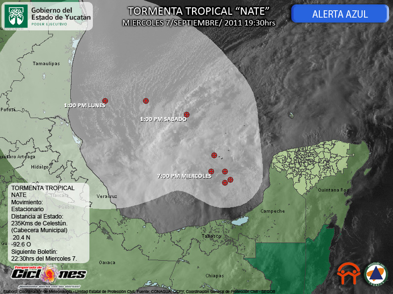 La Tormenta Tropical Nate presenta un movimiento estacionario sobre la Sonda de Campeche, continúa presentando vientos de 75Km/h y rachas de hasta 95Km/h los cuales se extienden principalmente hacia el Sur de su Centro