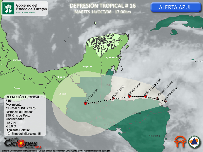 La Depresión Tropical #16 se ha desplazado hacia el Noroeste durante las últimas horas, su centro se estima a 745Kms de Peto, Yucatán y a 585Kms de Chetumal, Quintana Roo.