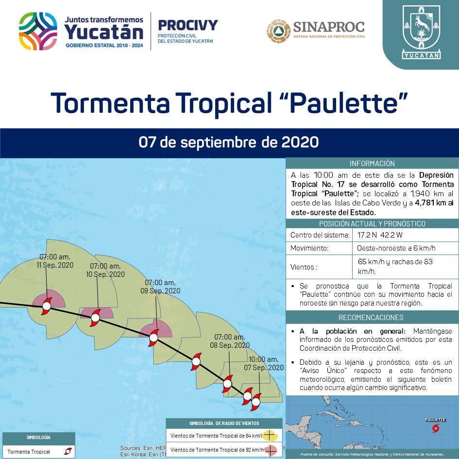 La Depresión Tropical No. 18 se desarrolló a Tormenta Tropical "Paulette"; se localiza a 1,940 km al oeste de las islas de Cabo Verde, África.
