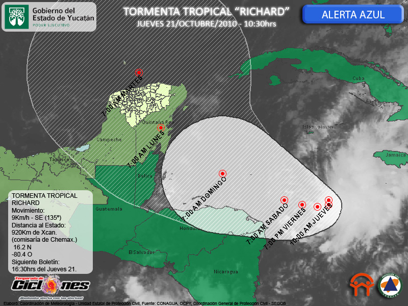 El Centro de la Tormenta Tropical Richard, se estima esta mañana a 875Km al Este-Sureste de Chetumal, Quintana Roo, y a 920Km al Sureste de la Comisaría de Xcan en el Municipio de Chemax.