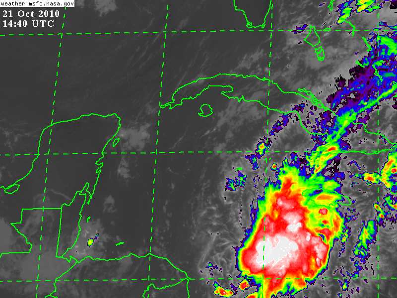El margen de error del pronóstico continúa siendo amplio, como se comentó ayer por la noche, sin embargo la trayectoria presentada hoy por la mañana, implica que el Sistema estaría intensificandose gradualmente durante los próximos días, alcanzando posiblemente fuerza de huracán el día Sabado, y desplazarse sobre el Sur de Quintana Roo ó Belice las primeras horas del día Lunes 25 de Octubre.