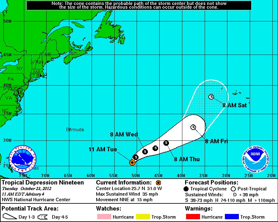 Se espera que la Depresión Tropical #19 continúe desplazándose sobre el Atlántico Norte sin amenazar al Continente.