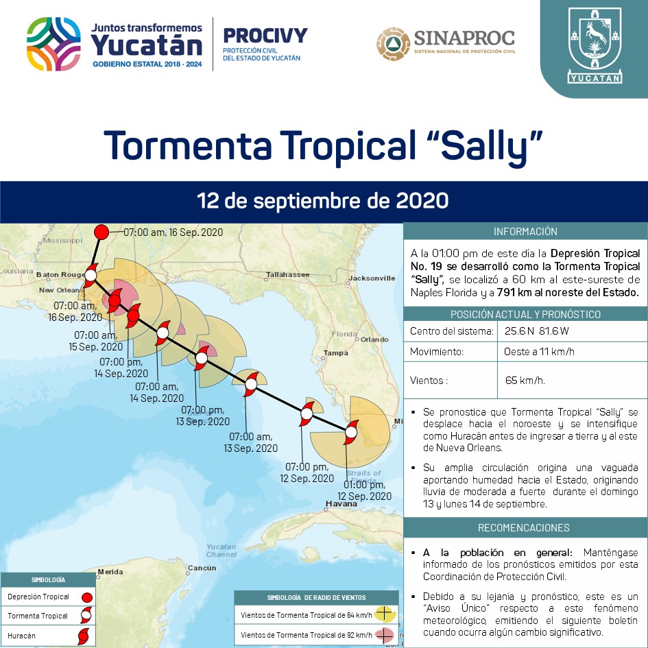 La Depresión Tropical No. 19 se desarrolló a Tormenta Tropical "Sally"; se localiza a 60 km al este-sureste de Naples, Florida, E.U.A., y a 791 km al noreste del Estado; se desplaza hacia el oeste a una velocidad de 11 km/h con vientos de 65 km/h.