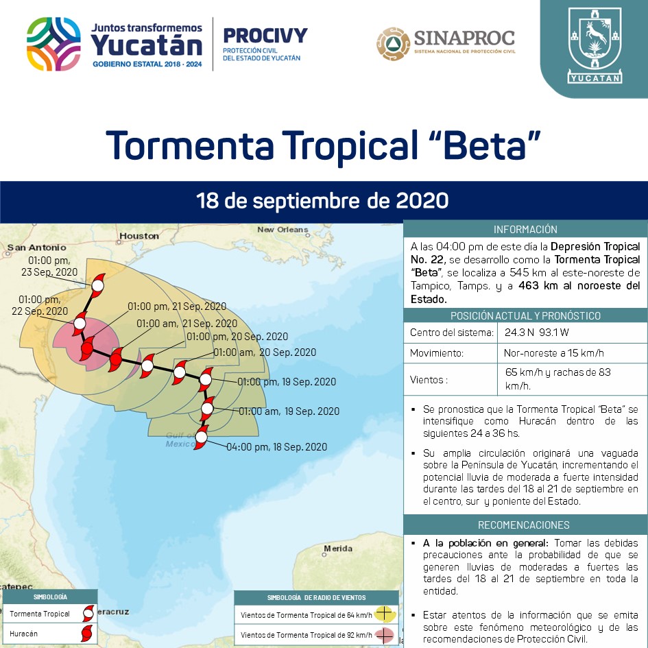 La Depresión Tropical No. 22 se desarrolló a Tormenta Tropical "Beta"; se localiza a 545 km al este-noreste de Tampico, Tamaulipas.
