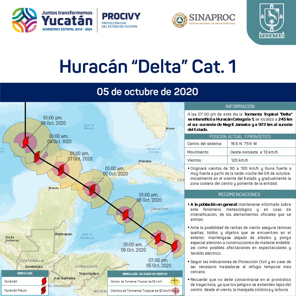 La Tormenta Tropical "Delta", se intensificó a Huracán Categoría 1, se localiza a 245 km al sur-suroeste de Negril, Jamaica, y a 973 km al sureste de Yucatán.
