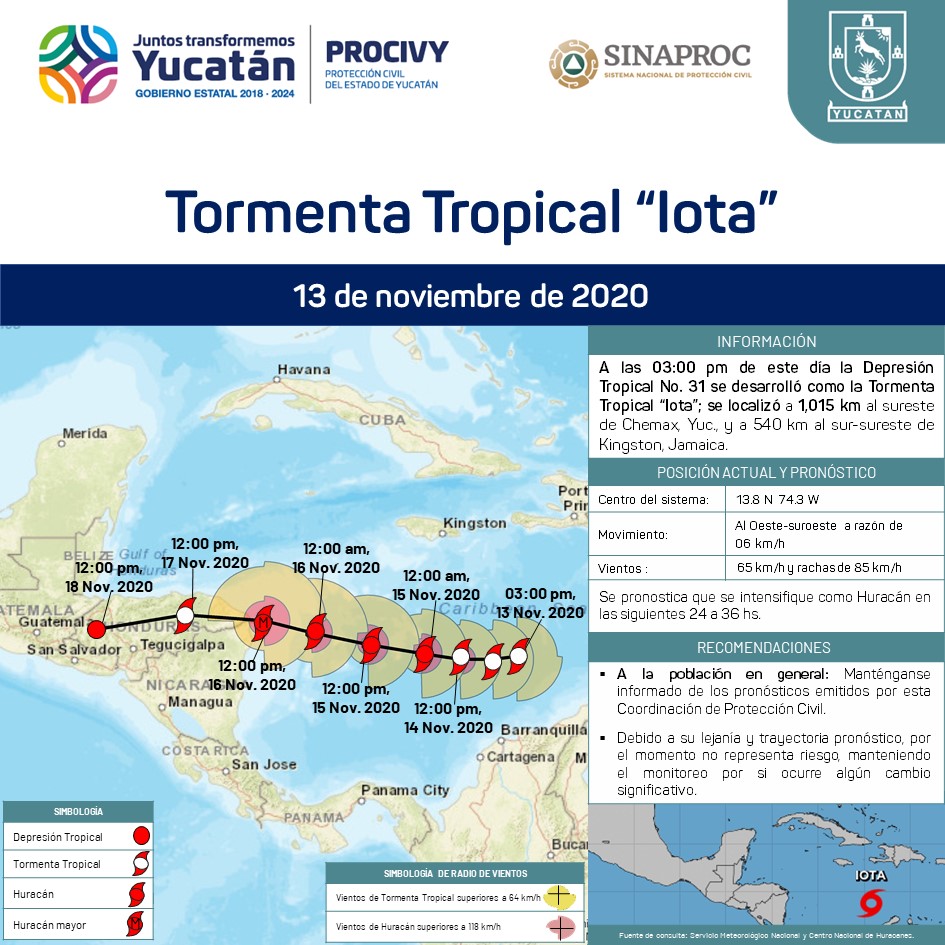 La Depresión Tropical No. 31 se intensificó a Tormenta "Iota"; se localiza a 1,015 km al sureste de Chemax, Yucatán, y a 540 km al sur-sureste de Kingston, Jamaica.