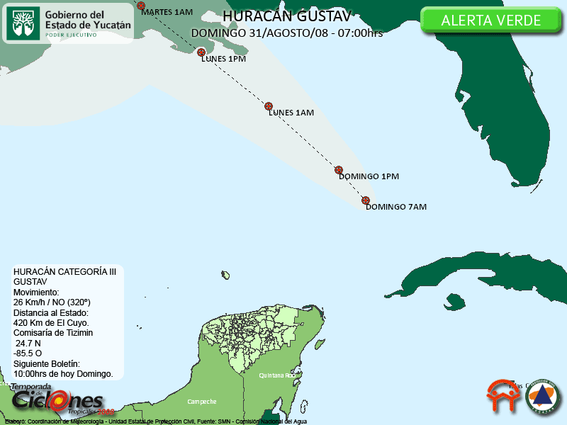 Gustav continúa su desplazamiento sobre el Sureste del Golfo de México. Se desplaza rapidamente, de acuerdo a lo pronosticado con anterioridad.