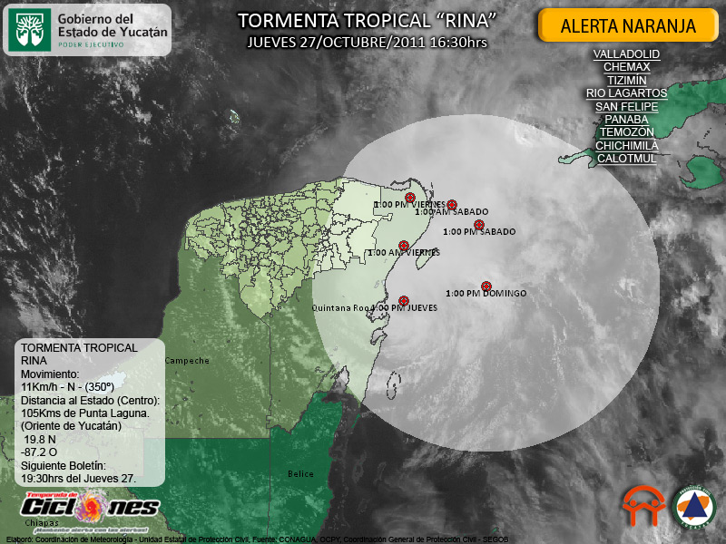Debido a la proximidad de la Tormenta Tropical Rina, de manera protocolaria y en alcance al Sistema de Alerta Temprana para Ciclones Tropicales SIAT-CT permanece en efecto Alerta Naranja para los Municipios de Valladolid, Chemax, Tizimín, Rio Lagartos, San Felipe, Panabá, Temozón, Chichimilá y Calotmul.