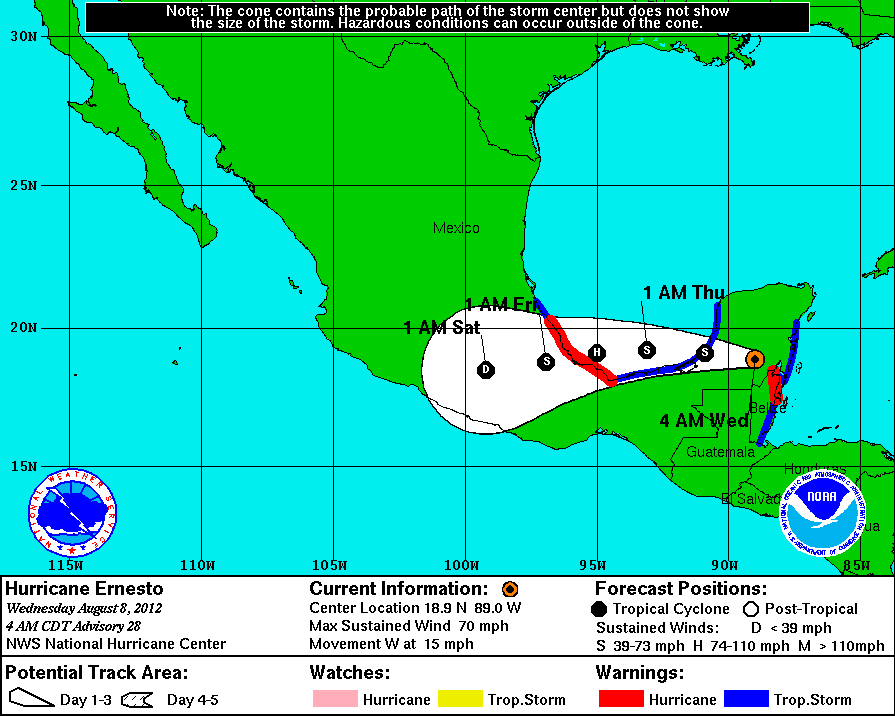 En congruencia con lo esperado, Ernesto se ha convertido nuevamente en una Tormenta Tropical sobre Quintana Roo, a 85Kms al Norte de Chetumal, 235Kms al Sur-Sureste de Mérida.