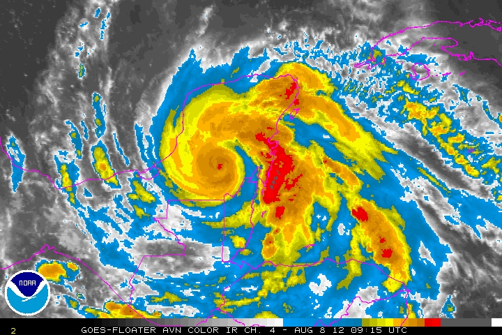 Ernesto continúa presentando un desplazamiento hacia el Oeste a razón de 24Km/h, vientos sostenidos alcanzan aún los 110Km/h y rachas hasta 130Km/h.