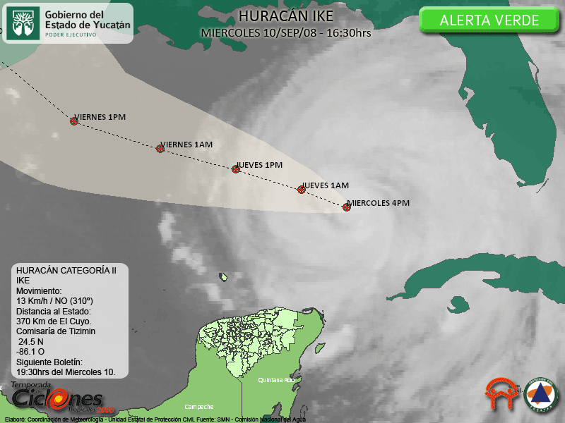 El Centro de IKE se estima en estos momentos a 370 Km de El Cuyo, comisaría de Tizimin.