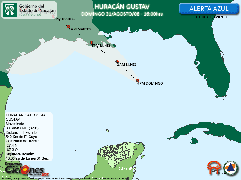 Se espera que Gustav continúe con su movimiento hacia el Noroeste durante las próximas horas, de esta forma la Costa Norte del Golfo de México, en Estados Unidos, comenzará a sentir sus efectos directos al anochecer de hoy domingo, para que su centro se desplace sobre tierra mañana, cerca del medio día.