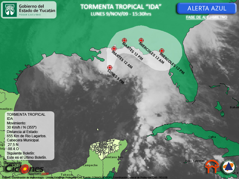 Se espera que la Tormenta Tropical IDA continúe con su desplazamiento hacia el Norte alejandose de nuestro Estado durante el día de hoy Lunes y que se desplace sobre las costas de Estados Unidos hoy por la noche ó las primeras horas de mañana Martes.