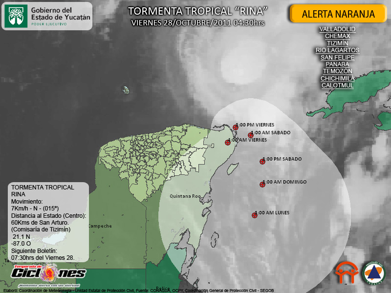 Debido a la proximidad de la Tormenta Tropical Rina permanece en efecto Alerta Naranja para los Municipios de Valladolid, Chemax, Tizimín, Rio Lagartos, San Felipe, Panabá, Temozón, Chichimilá y Calotmul. en el marco del Sistema de Alerta Temprana para Ciclones Tropicales SIAT-CT. en el Estado de Yucatán.