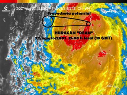 Se esepra que el Ojo del huracan Dean se encuentre a las 7:00 PM Hora local en tierra, al Norte del Estado de Hidalgo, cerca de Orizatlán.